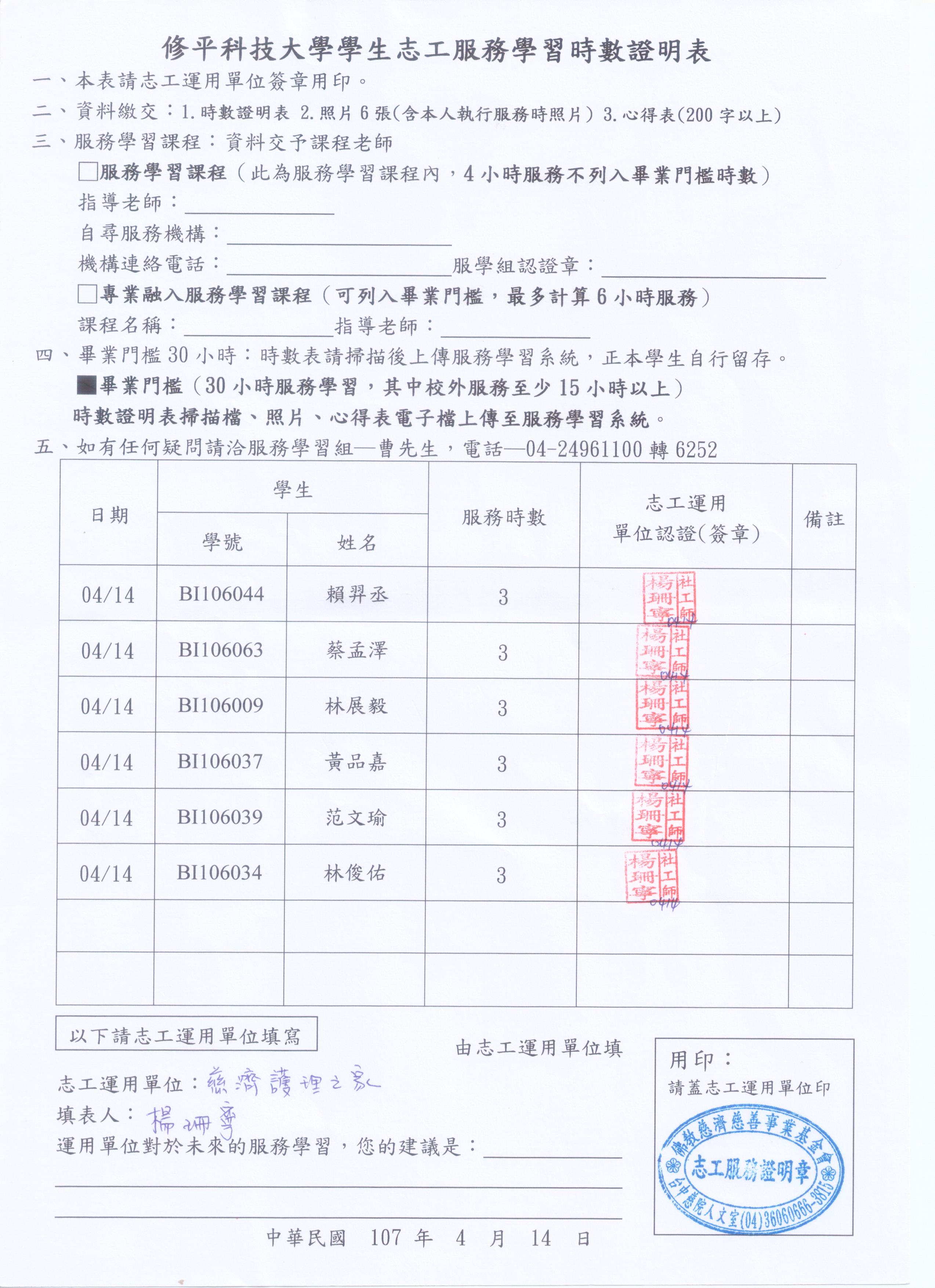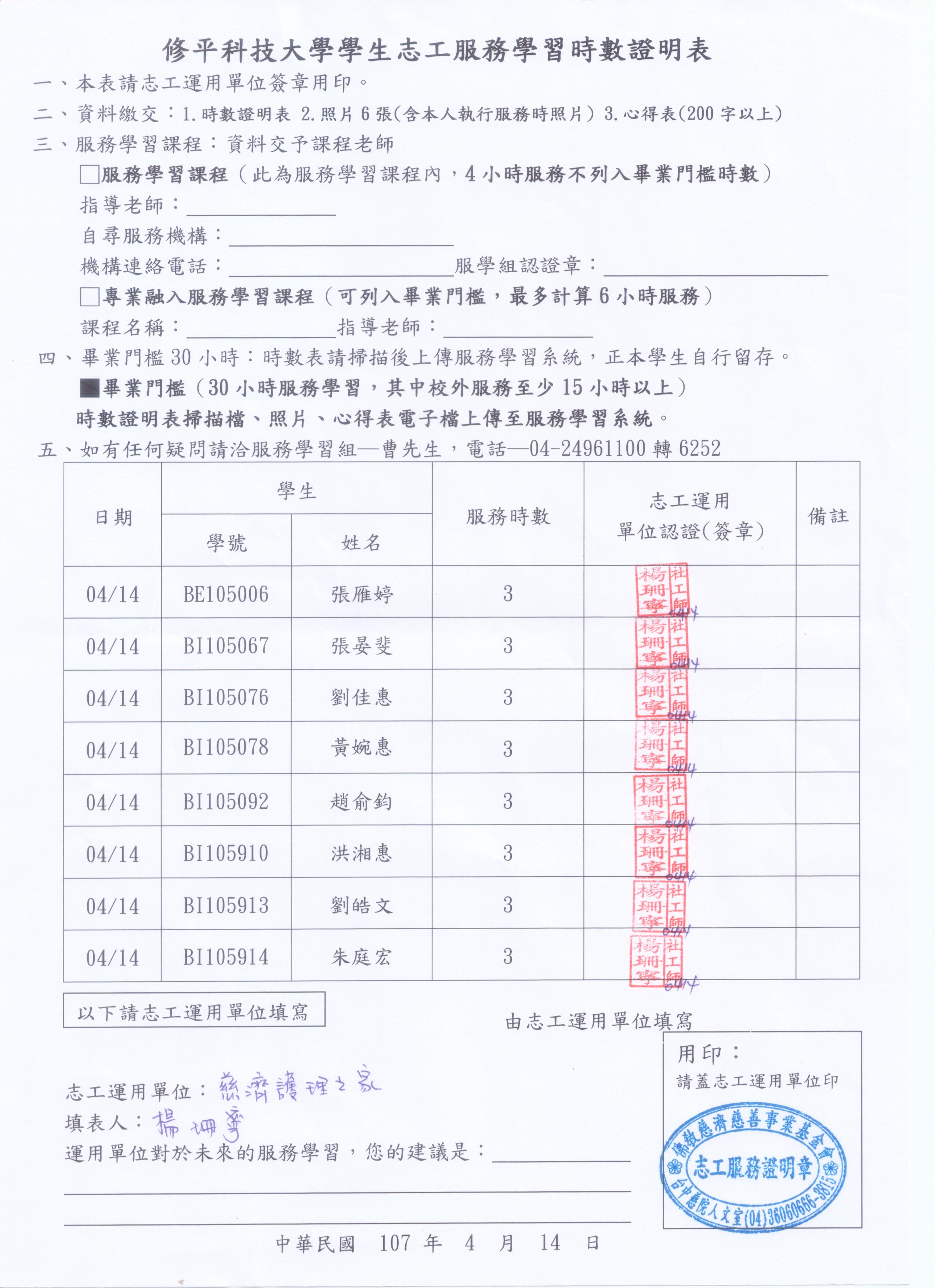 4月14日慈濟護理之家服務學習時數表