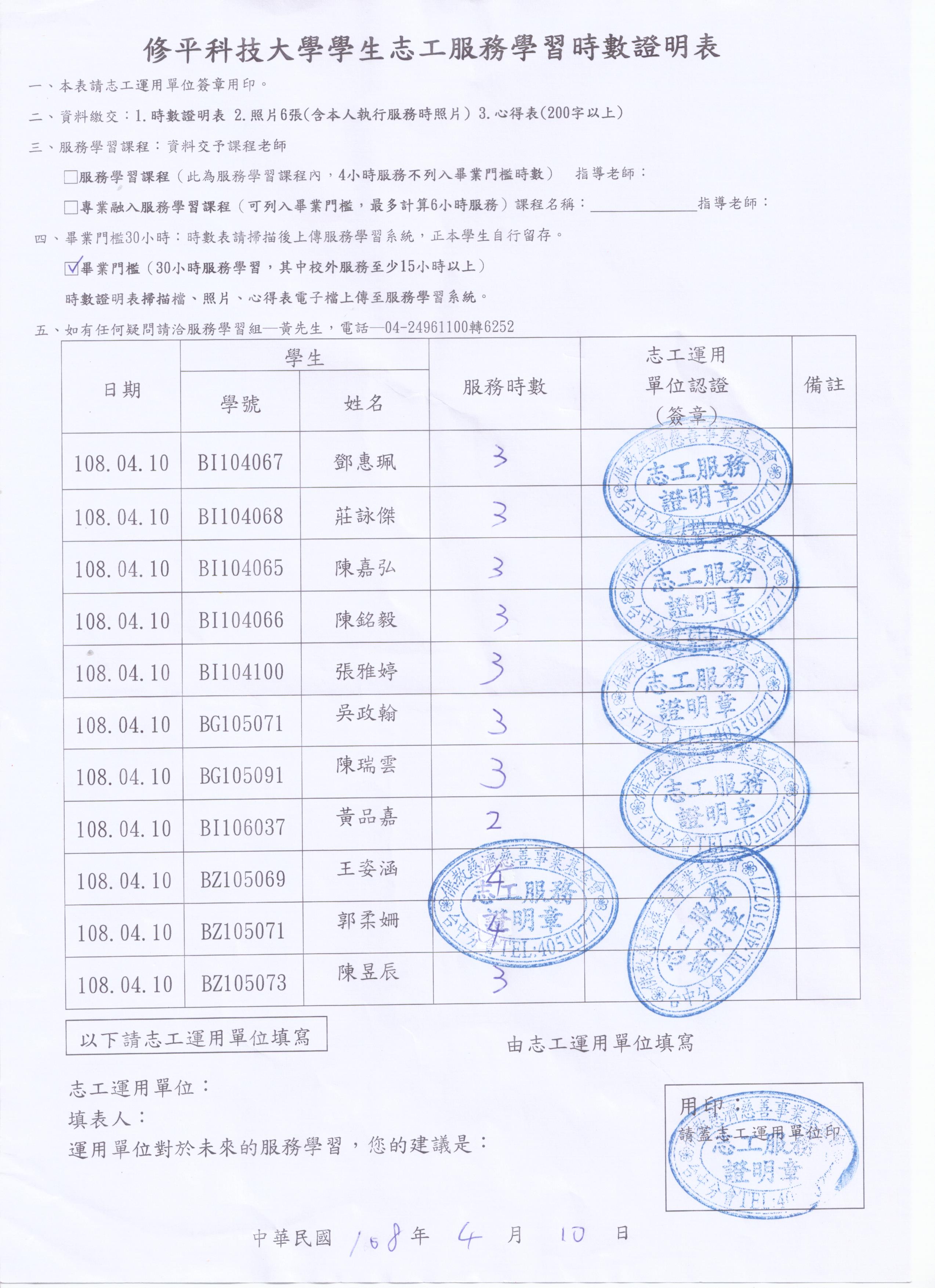 如附檔,  需傳時數表,心得表,與照片三者SIS上傳繳交給服學組, 其中心得除了由SIS上傳繳交給服學組之外,另請mail:   ssching@hust.edu.tw    信件標題:xxx1080410環保服務學習心得 , xxx為姓名