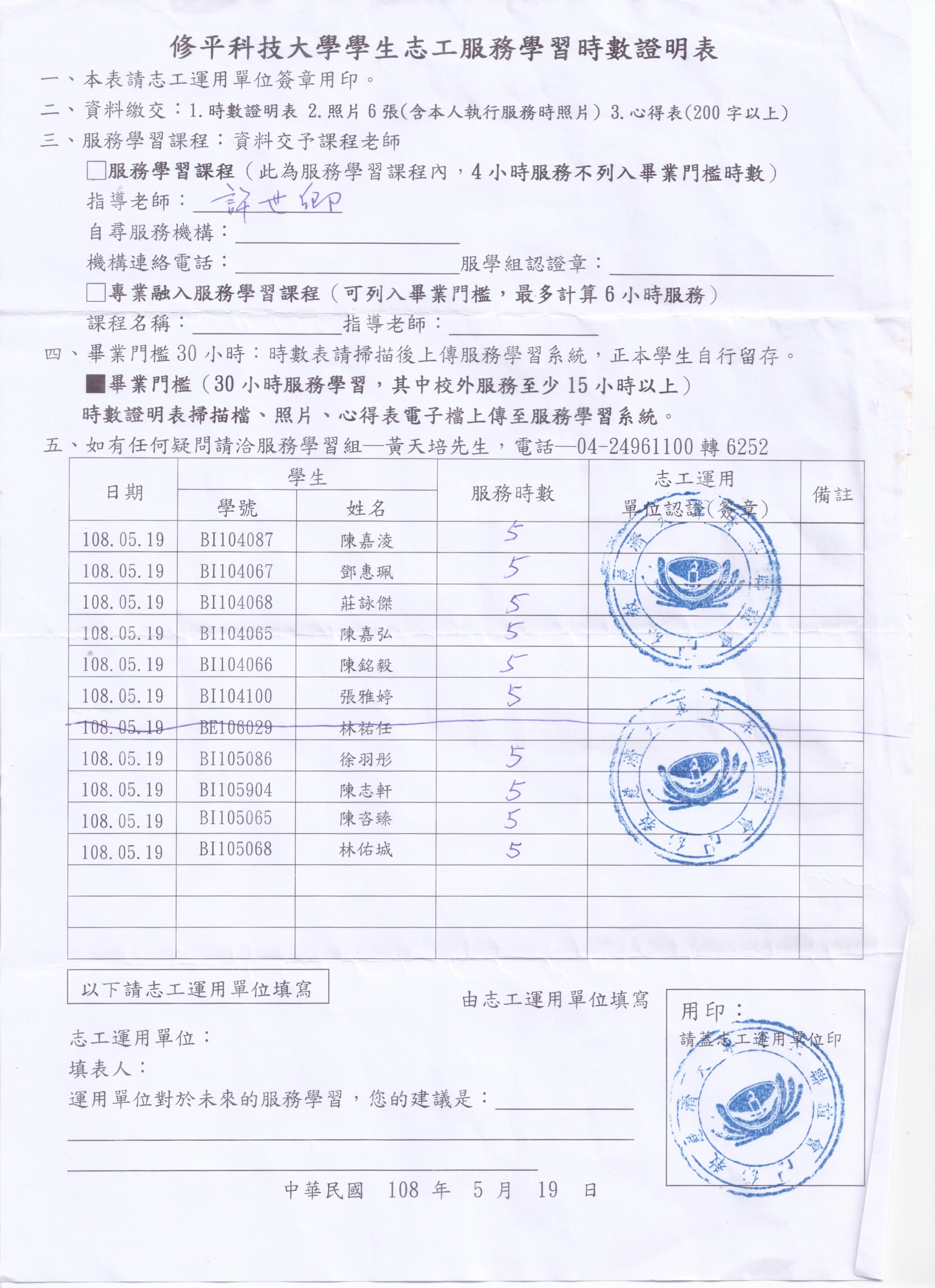 如附檔,  需傳時數表,心得表,與照片三者SIS上傳繳交給服學組, 其中心得除了由SIS上傳繳交給服學組之外,心得另請mail:   ssching@hust.edu.tw  (許世卿老師信箱)  信件標題:xxx1080519信望愛健檢務學習心得 , xxx為姓名