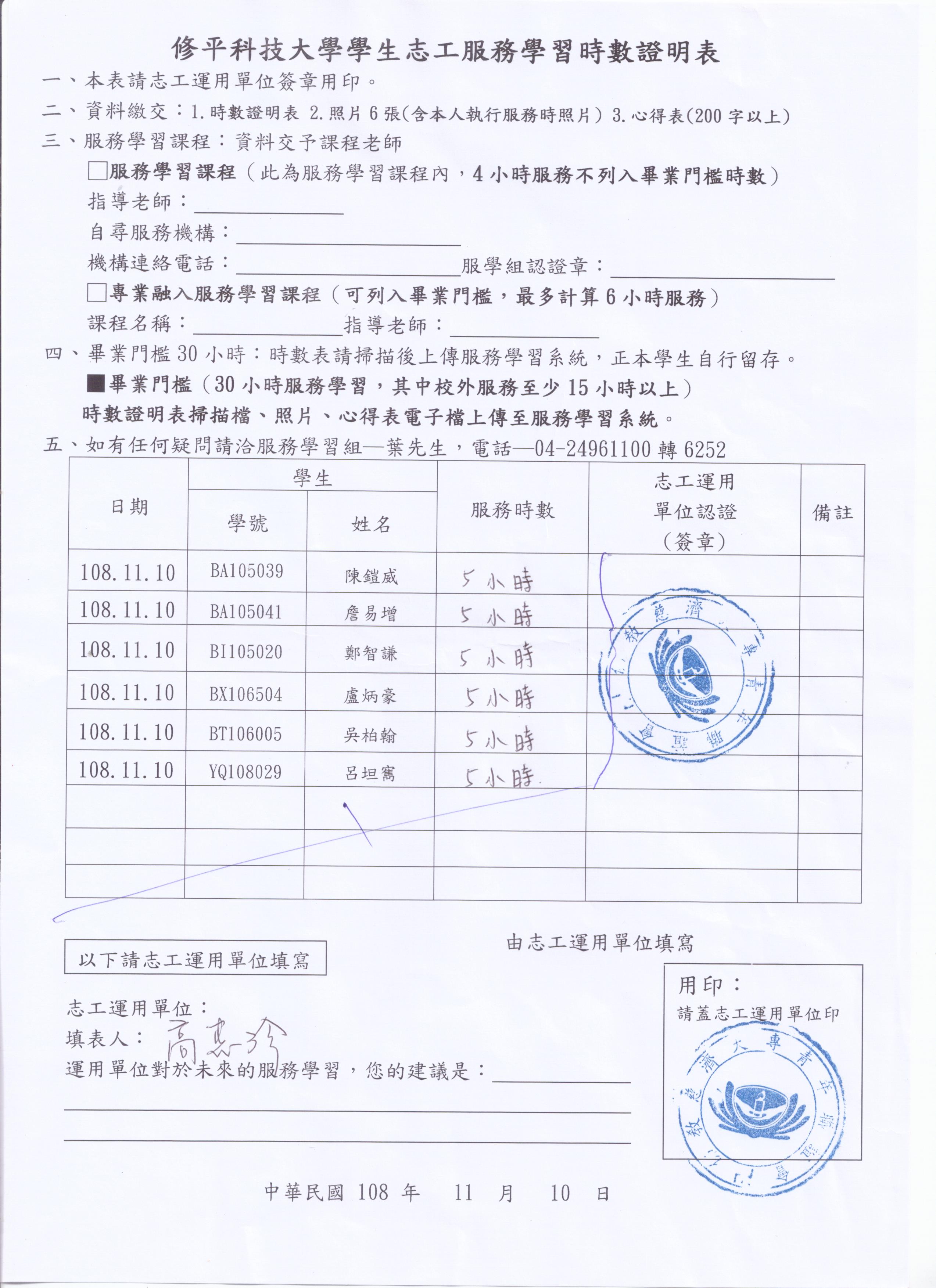 108.11.10二手衣整理-送愛到莫三比克服務學習時數表