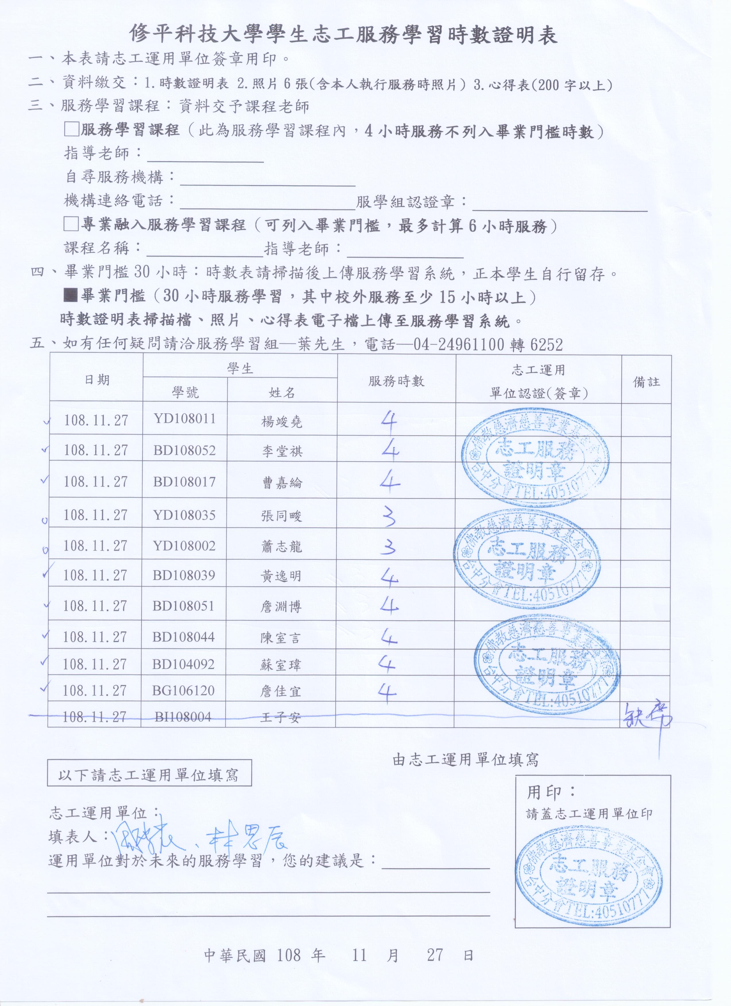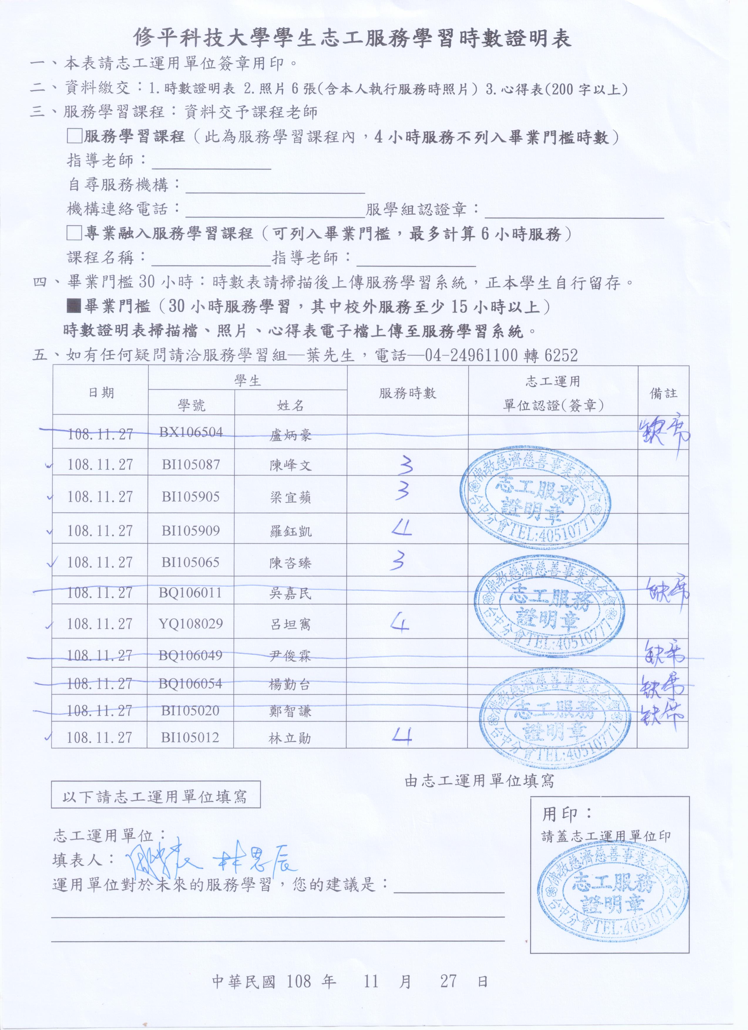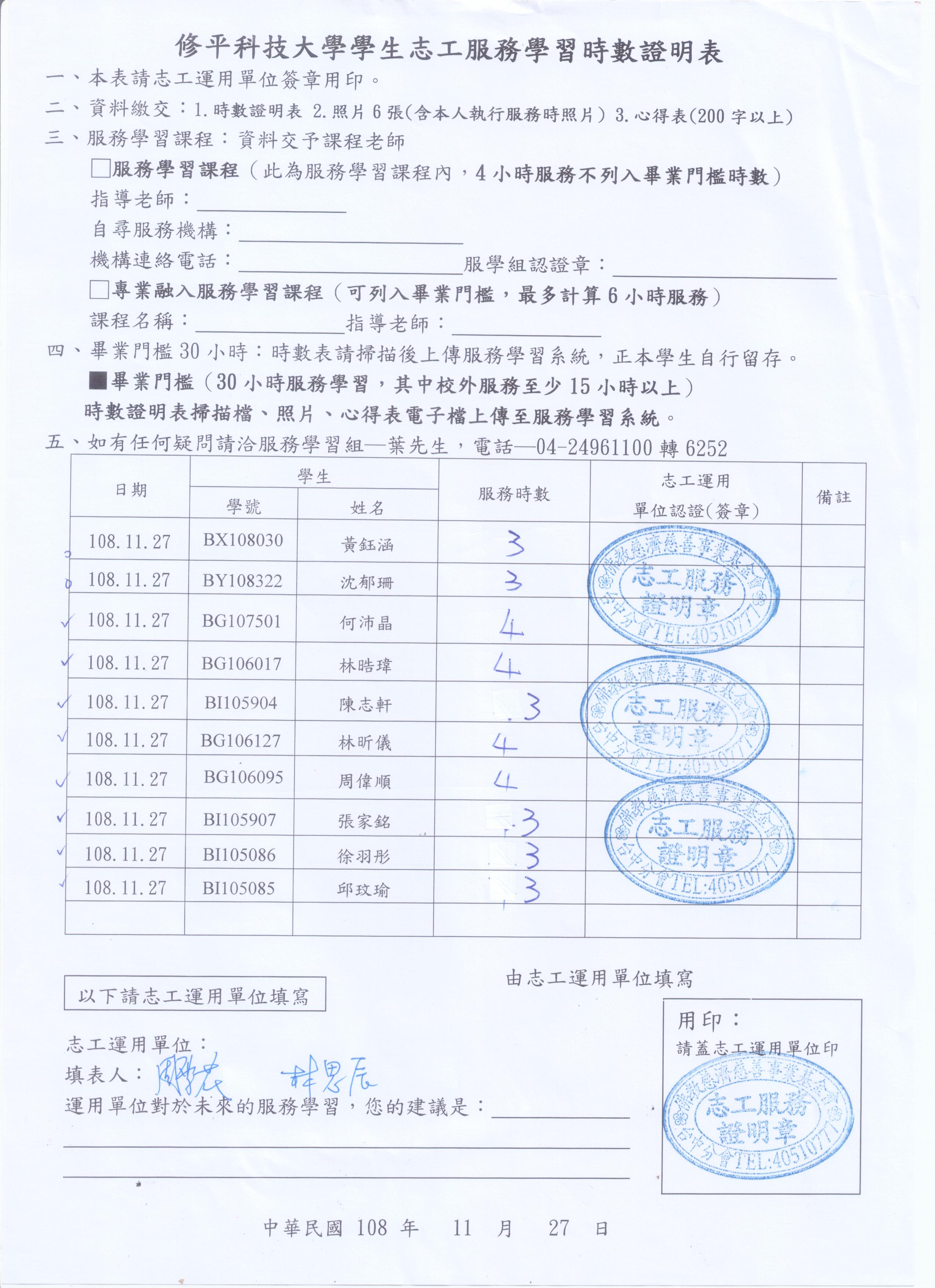 如附檔,  需傳時數表,心得表,與照片三者SIS上傳繳交給服學組, 其中心得除了由SIS上傳繳交給服學組之外,另請mail:   ssching@hust.edu.tw    信件標題:xxx1081127環保服務學習心得 , xxx為姓名