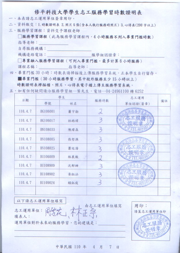 需由SIS進入上傳時數表,心得表及照片, 心得表請同時emai到 ssching@hust.edu.tw 主旨: xxxxx20210407服務學習心得,xxxxx為學號姓名