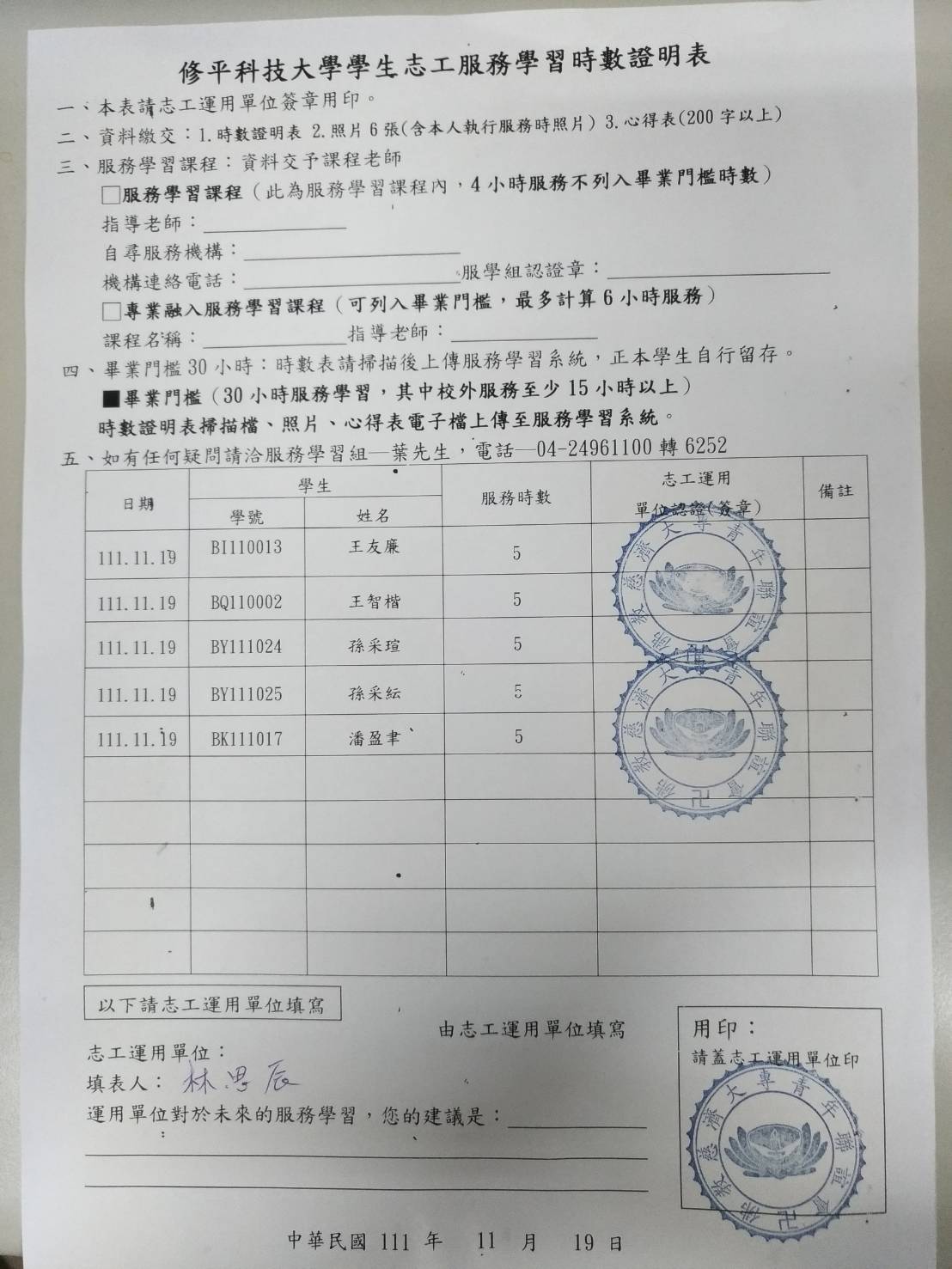 需由SIS進入我的服務學習區,上傳時數表,心得表及照片通過服學組審核, 心得表請同時emai到 ssching@hust.edu.tw 主旨: xxxxx20221119務學習心得,xxxxx為學號姓名