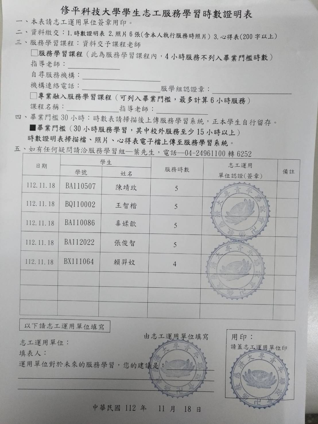 需由SIS進入我的服務學習區,上傳時數表,心得表及照片並點送出-讓服學組審核, 心得表請同時email到 ssching@hust.edu.tw 主旨: xxx20231118服務學習心得,xxx為學號姓名