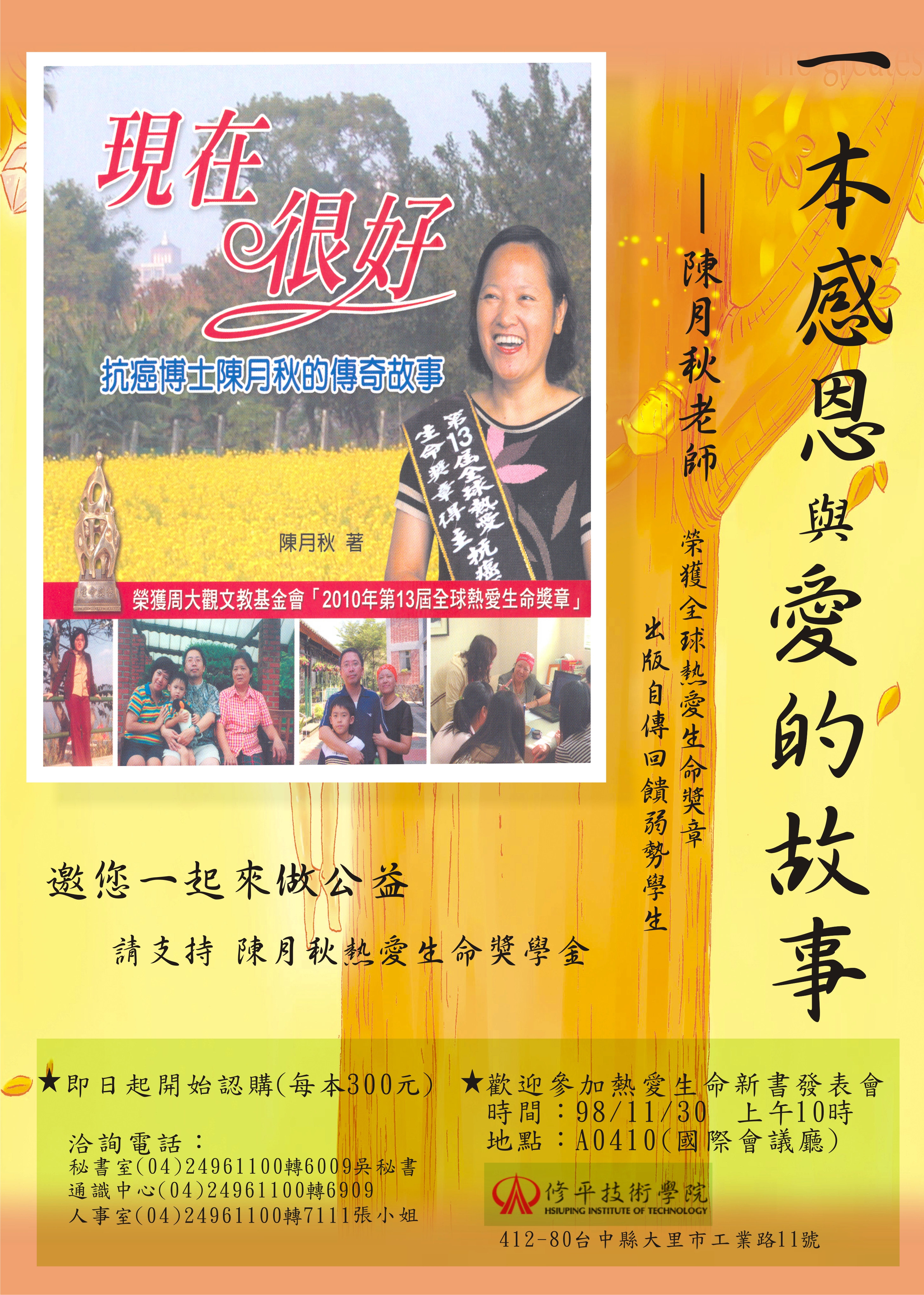 生命有限 活著就要有光有熱 為世間加溫 月秋不知道自己還有多少時間 在有限的生命裡 必須選擇先做最有意義的事 既然這是一件有意義的事 於是 我把自己的博論放一邊決定先做這件事 歷時一年半 才撰寫完成 這期間最有意義的是: 有不少修平的同學參與了這件事 感謝數媒黃淑英主任 李俊賢前主任 輔導雅茹 宣亨 勝凱同學 協助拍製紀錄片還有意紋 舒茵為繪製繪本 應中系的琬婷 紫旋 瑩婷 書妘等幫忙校稿活動等事宜 大家共同完成生命教育多元教材開發 有書 有紀錄片 有小繪本 尤其感謝基金會出資編印成書 並捐本校 作為修平熱愛生命獎基金 最後 感謝大家一起共襄盛舉 一起來散發生命的光與熱讓修平校園再增添一些愛的故事與希望 讓這光與熱 跨出校園 一起把愛傳出去