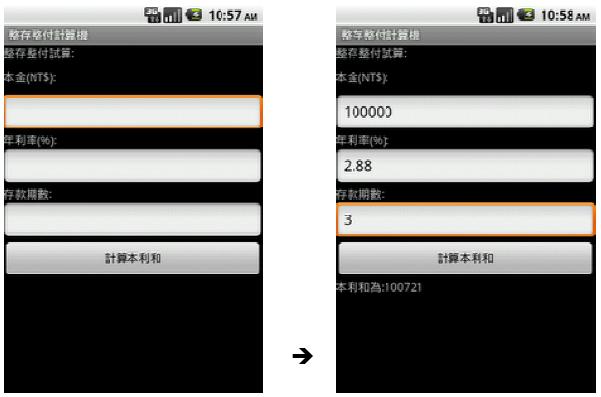 | 描述 | 1. 完成課堂BMI練習。 a. 利用 xxx.getText().toString() 可取得輸入資料(字串需轉換為數值). ex: 輸入身高: 170 則 edHeight.getText().toString() 即會回傳 "170" 將資料以 Integer.parseInt(...) 或 Double.parseDouble(...) 轉換為數值資料. b. 利用 BMI 公式計算結果(假設 h 存放身高-公分, w存放體重-公斤). double bmi = w / ((double)h/100* h /100); c. 利用 xxx.setText() 將結果顯示在相對應的View元件上. tvResult.setText(...); tvSuggest.setText(...); 2. 完成[零存整付]的作業 ! 畫面如下圖, 在輸入本金和年利率與存款期數 , 按下計算本利和的按鈕 , 就會在下方顯示本利和。 公式: 本利和 = 本金* ( 1 + 年利率/ 12) ^ 月數 ; 注意:x ^ y --> 表示 [x的y次方]; 你需要利用 Math.pow( x, y) 來計算. ![]() a. 請下載附件 GDD101.zip (可執行檔案為 GDA101.apk), 並完成匯入的動作以完成作業寫作. b. 完成以下設計要求: b1. 本金欄位、期數欄位需限制輸入整數. b2. 利率欄位需限制輸入浮點數.(不可輸入文字) b3. 畫面中的文字資訊均須參考到字串資源常數 (./res/string/xxx ) b4. 最終本利和只要顯示整數部分即可. Best Regards, James |