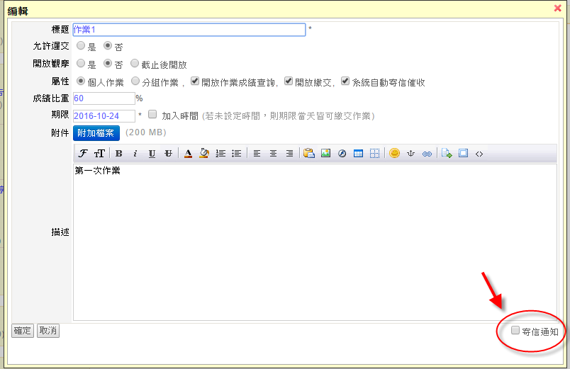 可能要請老師在發佈作業前檢查是否有勾選"寄信通知"的項目(預設是未勾選),如下所示: